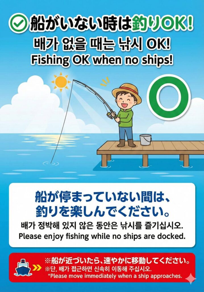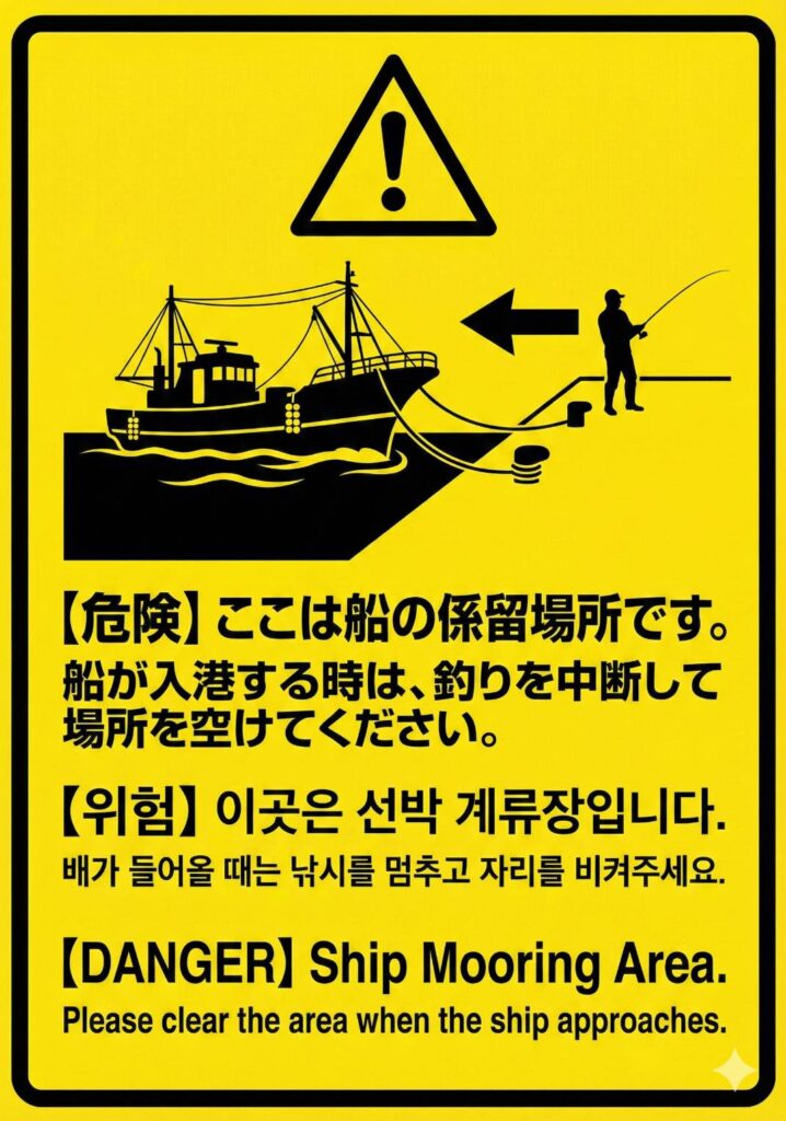 最近、私の港では韓国からの釣り客が増え、係留場所での安全確保が課題でした。言葉が通じない中、私はGeminiに「見るだけで伝わる貼り紙を作りたい」と相談しました。 私が想像していたのは、Wordで作った無機質な文字だけの注意書き。しかし、AIが提示したのは、一目で危険が伝わる**「プロのようなイラスト入りのポスター」**でした。現在、それをラミネートして掲示していますが、言葉の壁を越えて、現場の秩序を守る強力な武器になっています。
